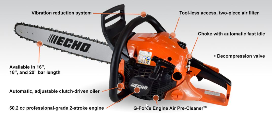 50.2cc 2-stroke commercial grade engine. Automatic, adjustable clutch-driven oiler for reduced oil consumption. Decompression valve for easy starting. G-Force Engine Air Pre-Cleaner™ for longer air filter life. Replaceable metal spike for improved user control and leverage. Side-access chain tensioner for easy chain adjustment. Spring vibration reduction system for operator comfort