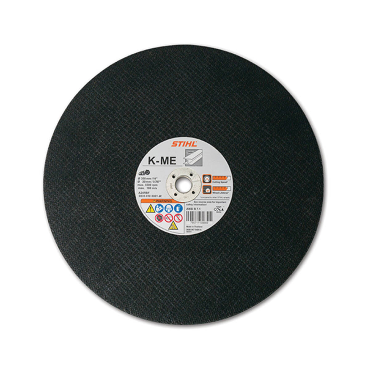 Fast cutting composite resin abrasive wheel for structural and stainless steel. Tailored specifically to STIHL TSA 230 and is ideal for cutting galvanized steel studs, rebar, stainless steel and structural steel. This wheel can also be used for nonferrous metal profiles. Chlorine-free, sulfur-free and iron-free.