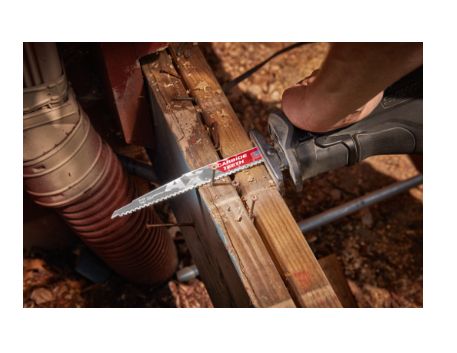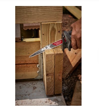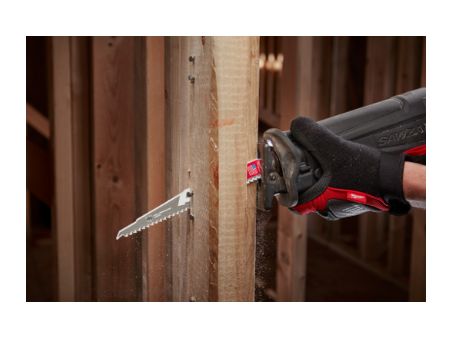 The Ax™ with carbide teeth, engineered to deliver long life in the toughest applications while being the fastest carbide-tipped recip saw blades on the market. These new blades will deliver 30X longer life over standard bi-metal blades and 2X faster cutting than other carbide blades. The Ax with carbide teeth features optimized carbide tipping technology that delivers extreme life. A fast, aggressive 5 TPI blade design allows for the fastest cutting in nail-embedded wood and a wide range of residential material. In addition, The Ax with carbide teeth will feature Milwaukee patented features Nail Guard™ and Fang Tip™. Nail guard allows the user to rip nails not teeth, delivering extreme durability. The Fang Tip™ provides the fastest plunging on any wood cutting blade on the market. The Ax with carbide teeth is optimized for cordless recip saws delivering over 25% more cuts per charge.