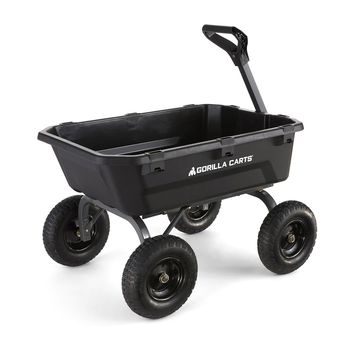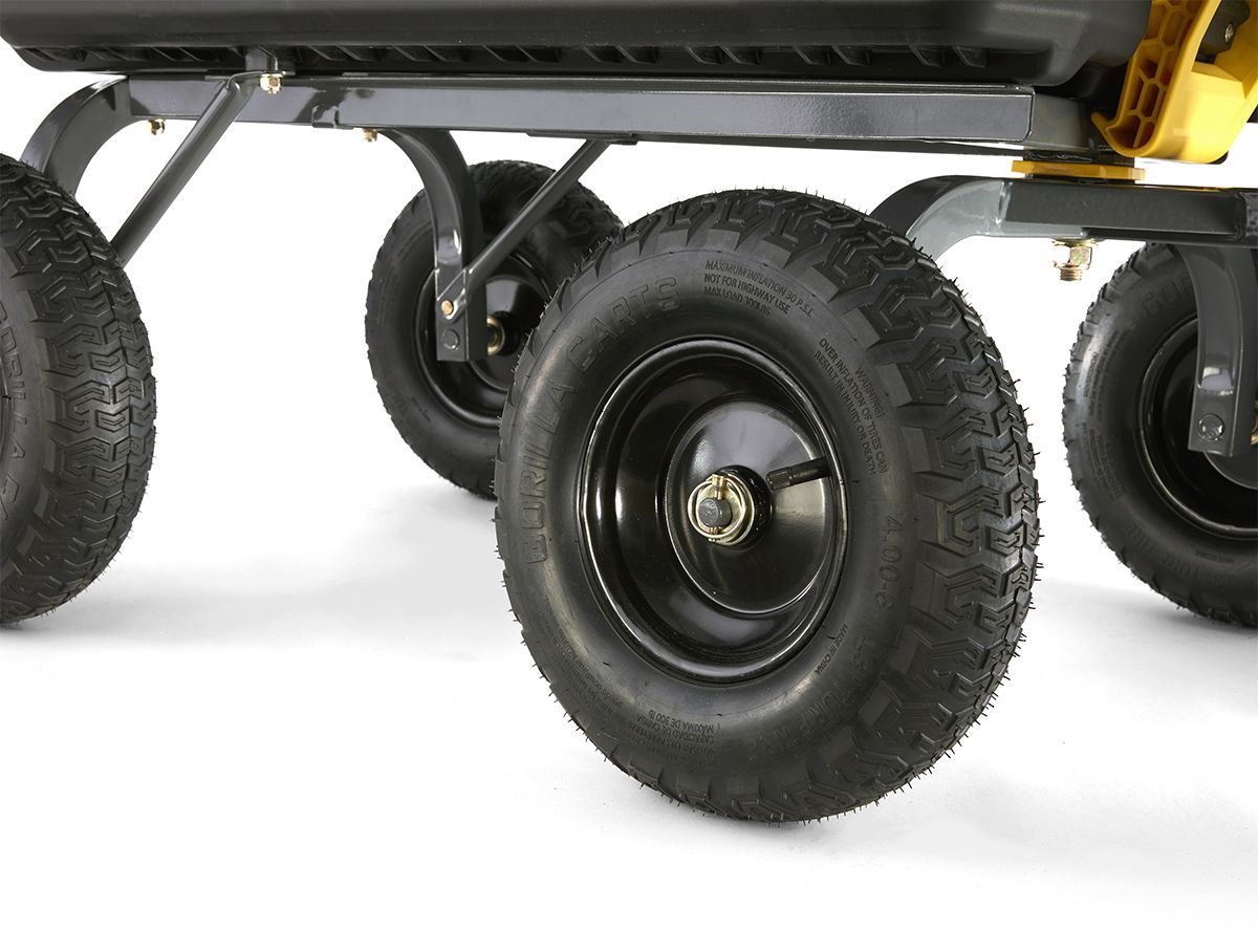 The Gorilla 7 Cu Ft Heavy Duty Poly Yard Dump Cart has a durable, impact resistant poly tub and innovative steel frame design. The new quick-release dumping system allows contents to be fully dumped and the zero-turn steering makes it easy to maneuver. The patented 2-in-1 handle allows cart to be towed behind a lawn tractor or ATV or pulled easily by hand, along with the balanced, extra wide base with 4-wheeled stability which makes it able to tackle heavy landscaping projects or garden projects. The GCG-7 is the perfect tool that saves time and reduces fatigue when hauling heavy dirt, mulch, gravel or plants.