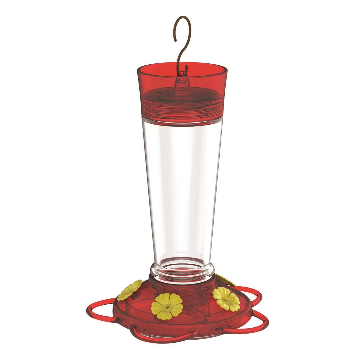 The Ruby Hummingbird Feeder is a stylish bird feeder with a glass bottle and built in ant moat. There are 5 perches.