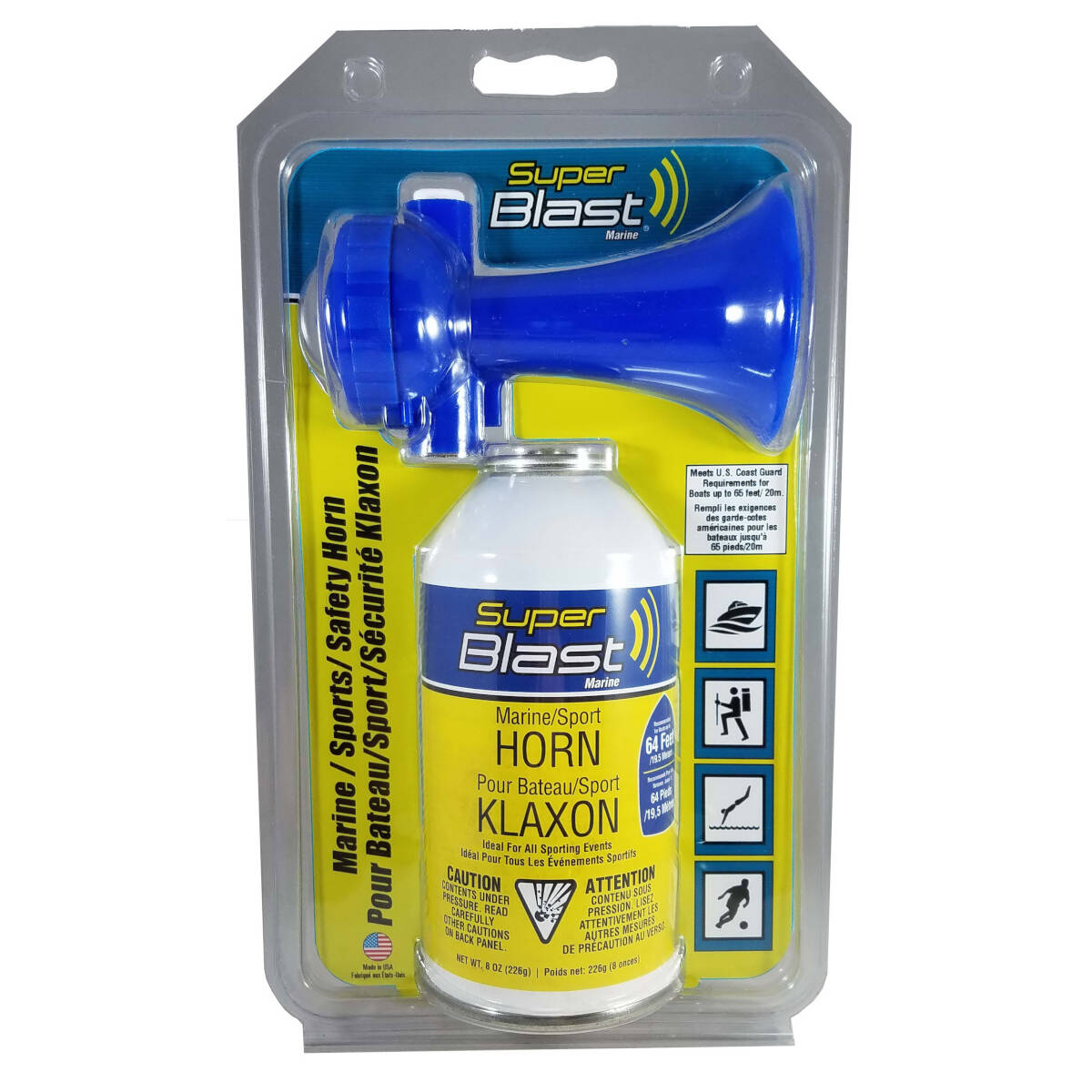 Super Blast™ air horn shoots a powerful blast of noise. Meets US Coast Guard requirements for boats up to 65 ft or 20 m. Perfect for auto, boat, sporting events and more.
