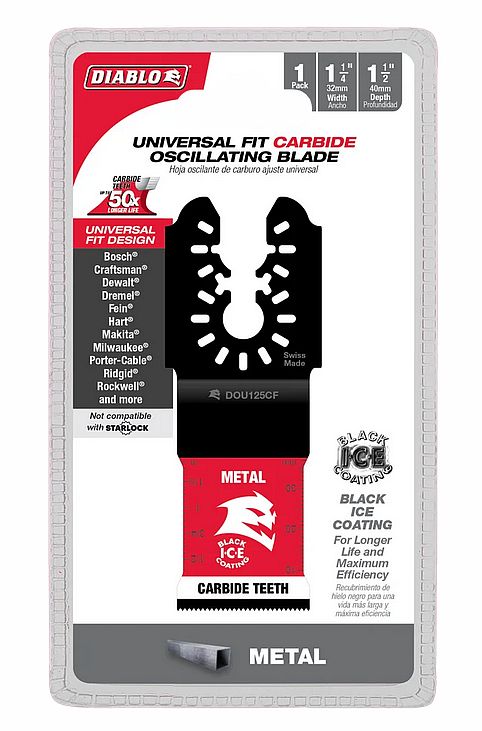 Diablos universal fit carbide oscillating blades feature application specific designs that deliver extreme durability and superior cutting life in metals. High-performance carbide teeth deliver an unmatched up to 50X longer cutting life versus standard bi-metal blades. An optimized blade and tooth design along with Black I.C.E. (Industrial Cooling Element) keeps the teeth cool and build up free for fast, clean cuts. The blades universal fit, adapter-free design easily attaches to most tools, with the exception of Starlock tools.