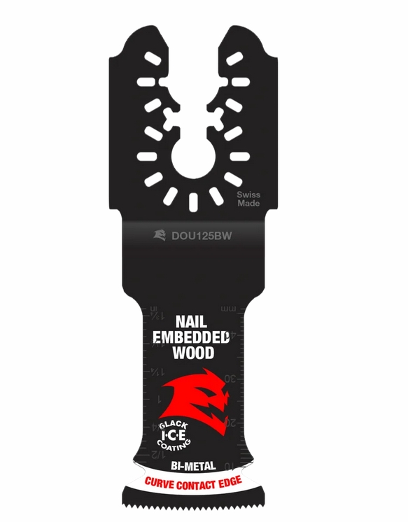 Diablos universal fit bi-metal oscillating blades feature application specific designs that deliver maximum durability and longer life in nail-embedded wood applications. These high-performance blades feature an ultra-hardened cutting edge to deliver up to 5X longer life than standard blades. Curve contact edge creates a pilot for precise, clean plunge cuts with less vibration. Black I.C.E. (Industrial Cooling Element) keeps the teeth cool and build up free for fast, clean cuts. The blades universal fit, adapter-free design easily attaches most tools, with the exception of Starlock tools.