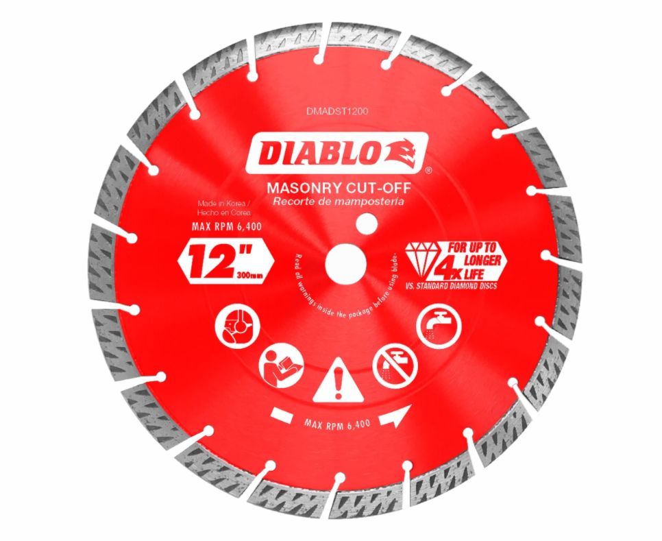 Diablo's diamond segmented turbo rim masonry cut-off discs provide extreme durability, faster cuts and longer life in concrete, concrete with rebar, brick and cinder block. These diamond rimmed discs deliver up to 30% faster cuts versus standard diamond cut-off discs. The disc's industrial-grade diamonds with hardened disc body delivers lasting durability and maximizes cutting quality in hardened materials even in extreme applications.