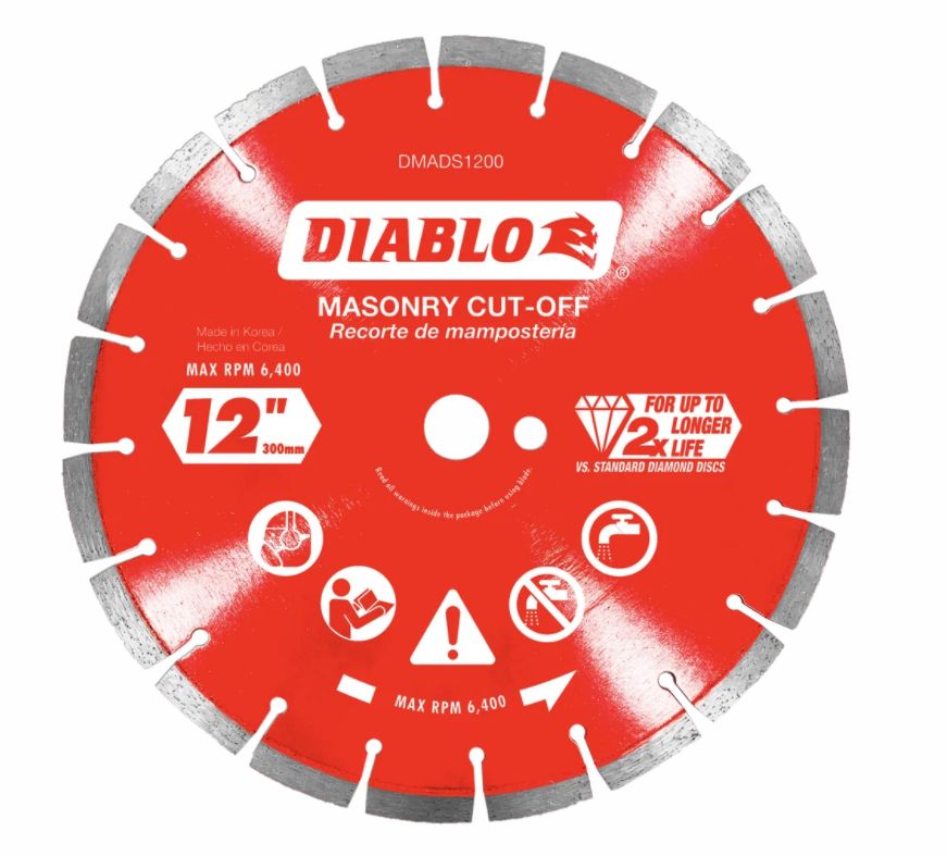 Diablo's diamond segmented masonry cut-off discs provide extreme durability and longer life in concrete, concrete with rebar, brick and cinder block. These diamond rimmed discs deliver up to 2X longer cutting life versus standard diamond cut-off discs. The disc's industrial-grade diamonds with hardened disc body delivers lasting durability and maximizes cutting quality in hardened materials even in extreme applications.