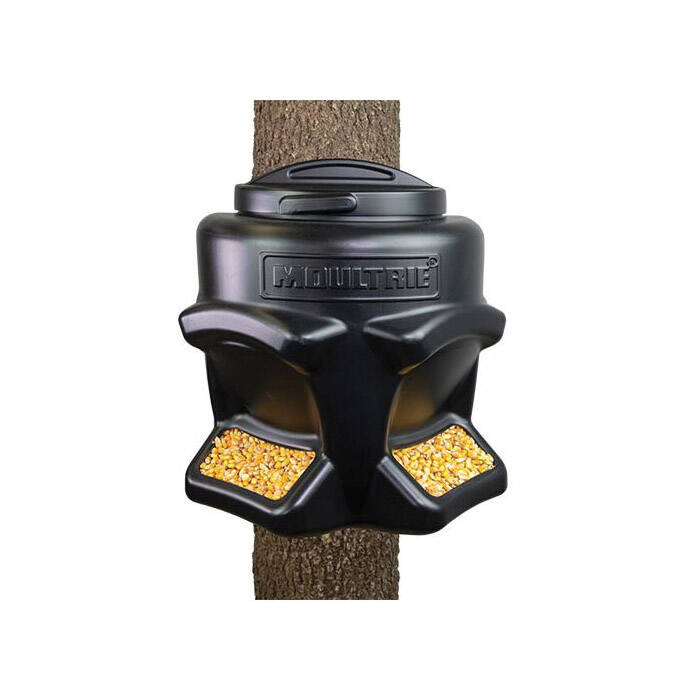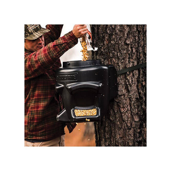 The Moultrie Feed Station II is based off of Moultrie's popular Feed Station. The Feed Station II has been redesigned and upgraded with features that improve wildlife feeding and keep operation simple. The Feed Station II will hold a 50 lb bag of corn and now comes with dual feed ports. Each feed port features integrated rain shields and weep holes to keep feed dry. This gravity style feeder can be used to feed corn, protein pellets, rice bran and any other type of wildlife feed. Another upgrade to the Feed Station II, is a new easy twist-on/twist-off lid. The feeder is quickly and securely strapped to a tree or post with the included strap.