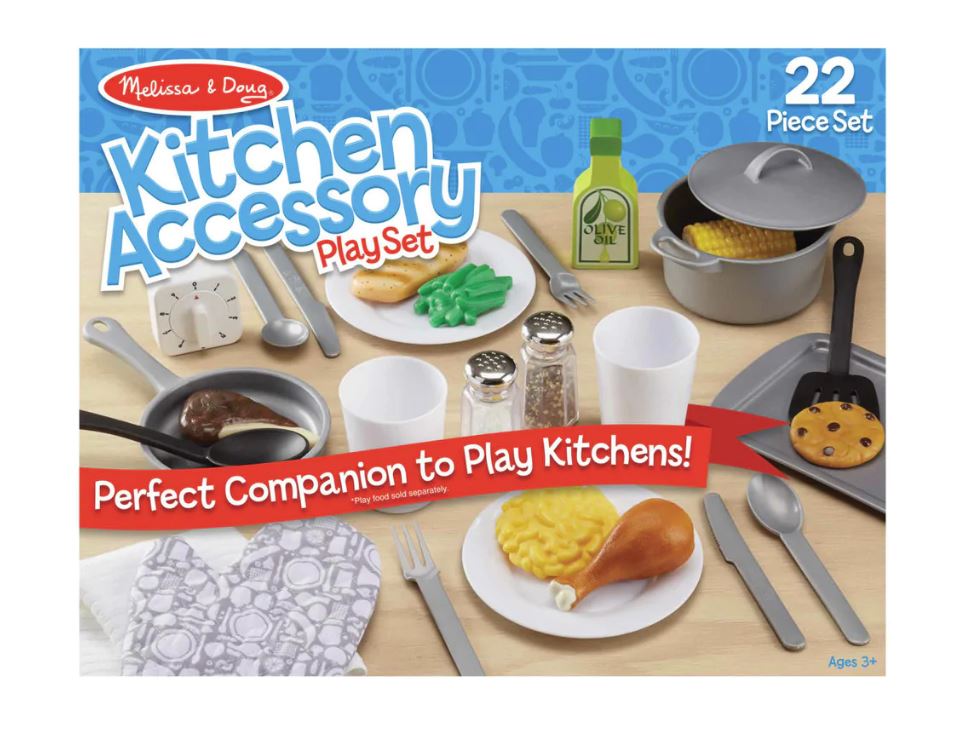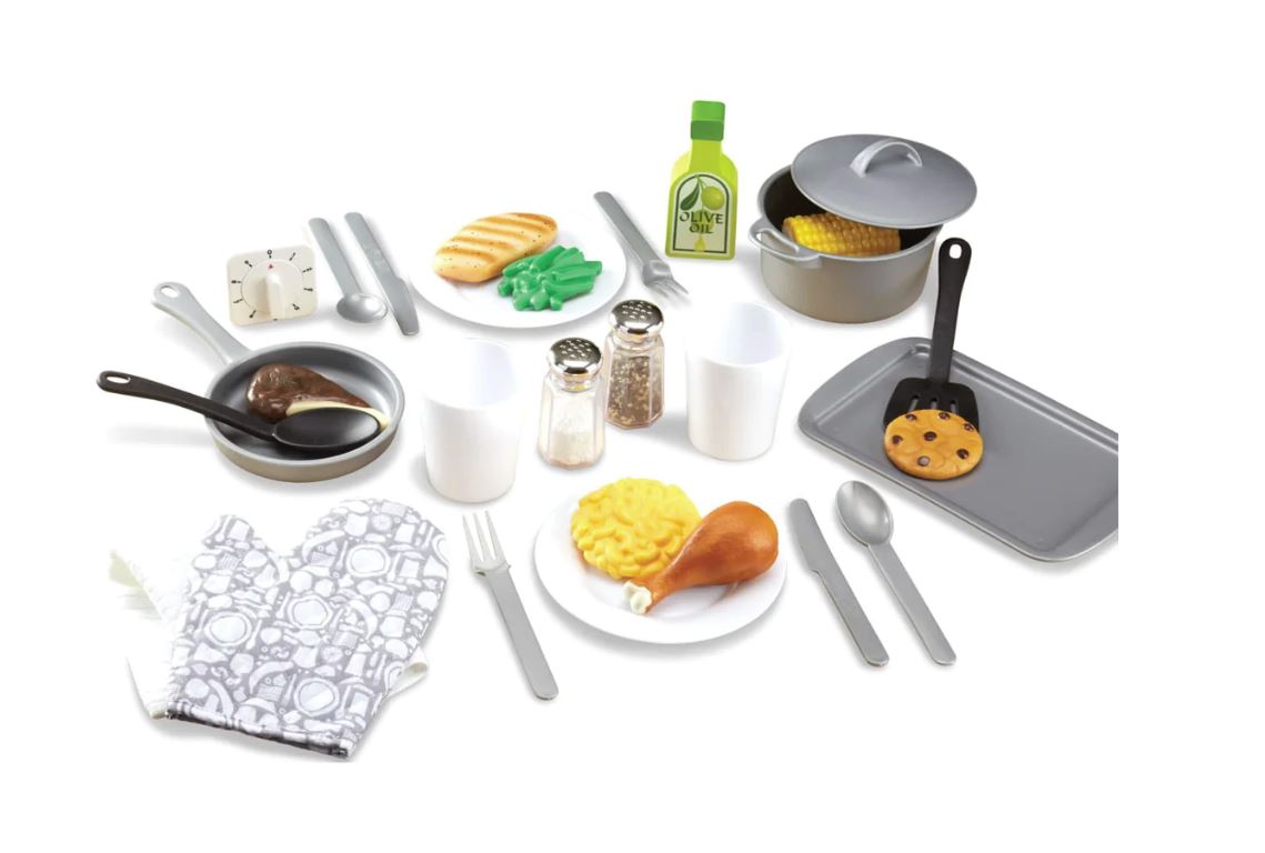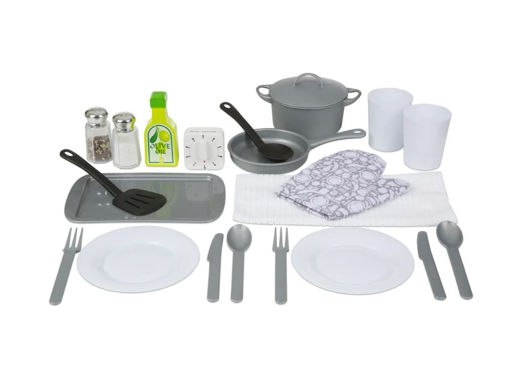 Play time will heat up with this perfect companion set to play kitchens! The 22-piece set includes a pot with lid, frying pan, cookie sheet, spatula, serving spoon, two plates, two cups, two forks, two knives, two spoons, and a timer, all made of durable plastic that are top-rack dishwasher safe. There are also salt and pepper shakers, a wooden olive oil bottle, a dish towel, and an oven mitt. Budding chefs three and older will be able to cook and serve up imaginative fun for years to come with this kid-sized cook set.