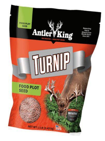 The Antler King® brand Turnip can be planted as a stand alone food plot or mixed with other forage — such as Clover, Chicory or other cereal grain. Best planted in July through September for a great hunt plot. Deer generally will consume the “greens” and then eventually dig out the turnip bulb to eat.