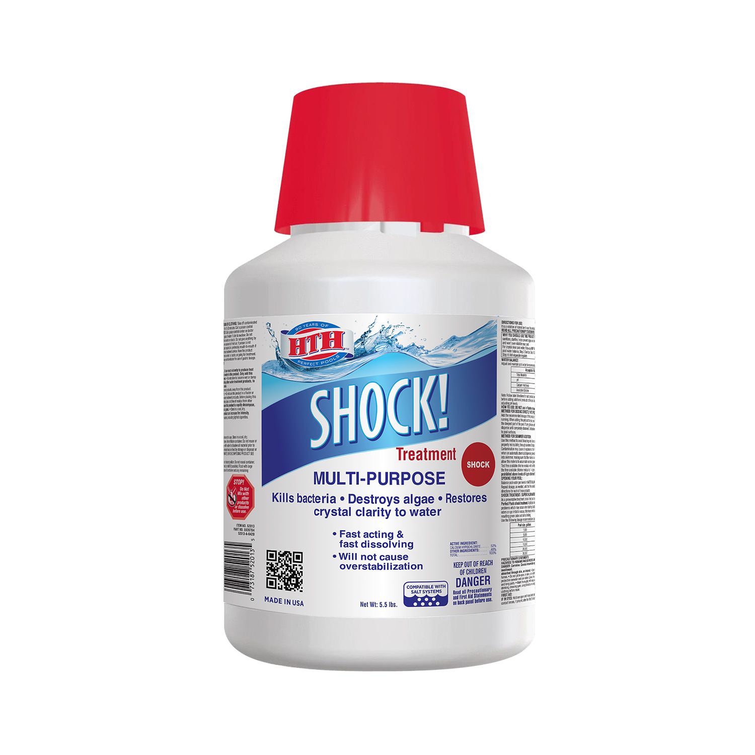 HTH® Shock! Treatment is the original swimming pool shock designed to boost chlorine levels and kill bacteria and algae for a clean, clear pool. This pool shock is great for all pool types and wont fade your pool liner. Test and apply shock treatment directly to your swimming pool every week to keep free available chlorine levels between 1 and 4ppm for healthy swimming conditions.