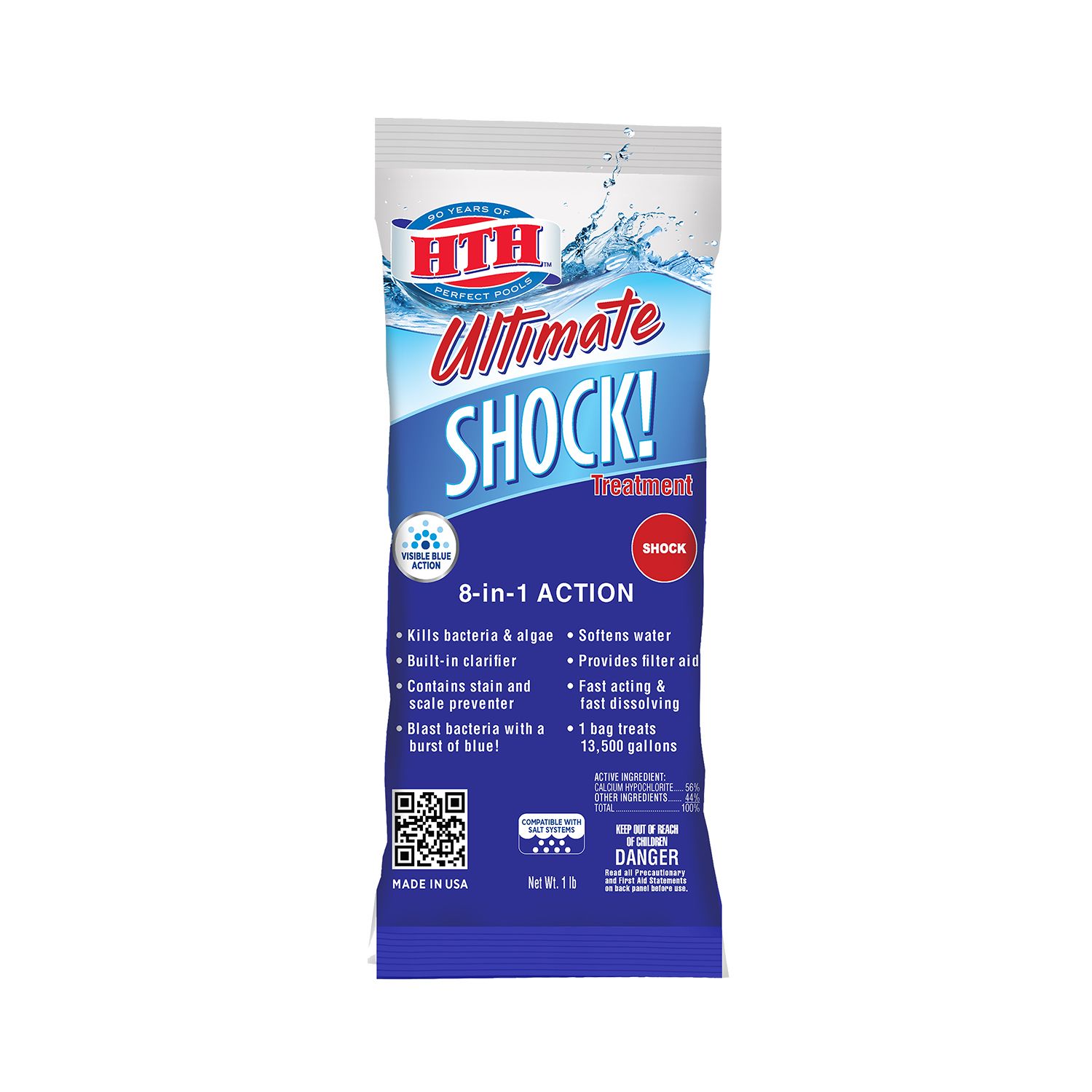 HTH® Ultimate Shock! Treatment is a highly effective, 8-in-1 multi-purpose shock product that works fast to kill bacteria and algae and restore crystal clarity to pool water within 24 hours.