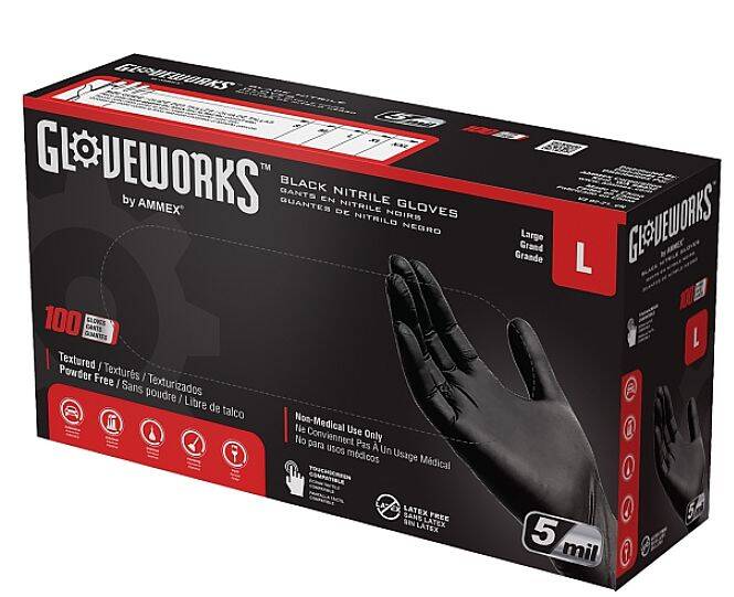 You're a pro who isn't afraid to take on the toughest jobs. You expect your gloves to meet your demands. AMMEX® GlovePlus® black nitrile powder-free industrial gloves will get as down and dirty as you need. It's the disposable glove that won't quit on you. These premium, industrial-grade nitrile gloves are the perfect combination of strength, dexterity and comfort. They're more than 50% thicker than standard nitrile gloves, which adds durability and that means fewer glove changes over the course of a shift. Nitrile has 3X the puncture resistance of latex and at 5 mil thick in the palm with 6 mil fingertips, they hold up when working with tools and machinery. They offer excellent protection against a long list of common and specialty chemicals. AMMEX® GlovePlus® black nitrile powder-free industrial gloves are nearly as elastic as latex, so they conform to your hand to deliver comfort, a great fit and a high level of tactile sensitivity. The micro-roughened surface and textured fingertips give them a dependable grip. A polymer coating makes them easy on and off and since they're powder-free, there's no residue to damage a perfect finish or an adhesive bond. This glove works for automotive, industrial, janitorial, sanitation, food service and safety applications. The black color hides dirt, grease and grime to help maintain a clean, professional look. They're made from component materials that comply with FDA regulations for food contact. There are also countless uses around the house, from cleaning to painting to repairs.