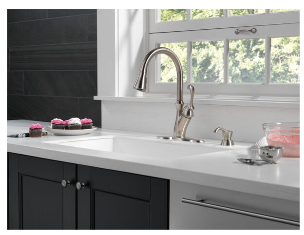 The pull-down spray wand comes free with a gentle tug and gives you total flexibility. The hose extends and retracts without friction points, fed by gravity. As you raise the wand to dock it, the magnet embedded in the spout pulls the wand precisely into place. So, unlike other pull-downs that tend to droop over time, MagnaTite® keeps your pull-down faucet looking picture-perfect. Delta's exclusive DIAMOND Seal® Technology uses a valve with a tough diamond coating. InnoFlex® PEX waterways keep water inside the faucet out of contact with potential metal contaminants. This powerful combination brings you a faucet built to last up to five million uses. Only Delta faucets are equipped with Touch-Clean® soft, rubber nubbins that allow you to easily wipe away calcium and lime build-up with the touch of a finger. The included escutcheon completes the ensemble for a more finished look.