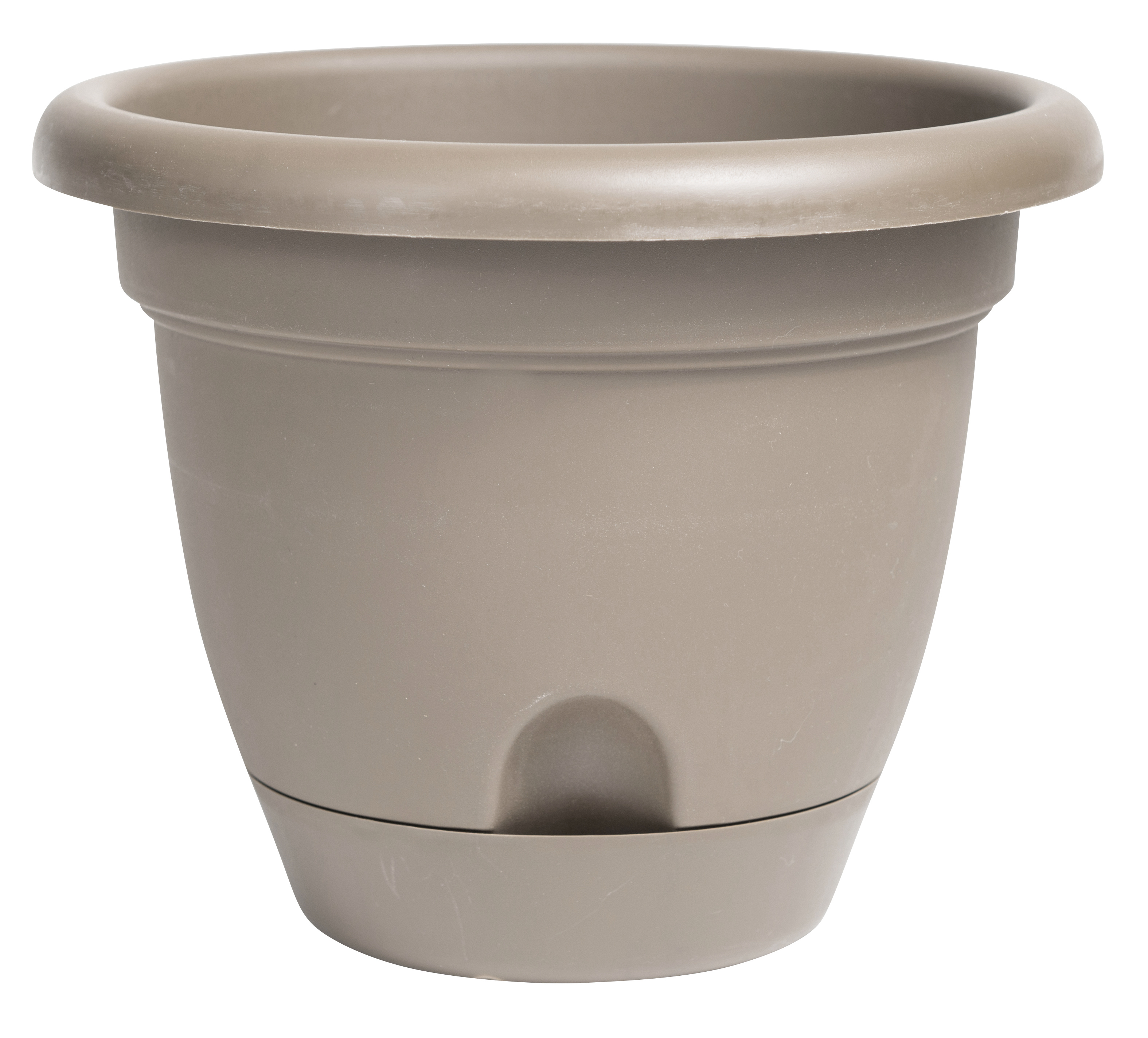 The Lucca Self-Watering Plastic Planter has a convenient self-watering attached tray with easy access spout for watering.