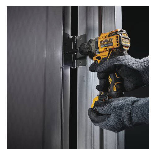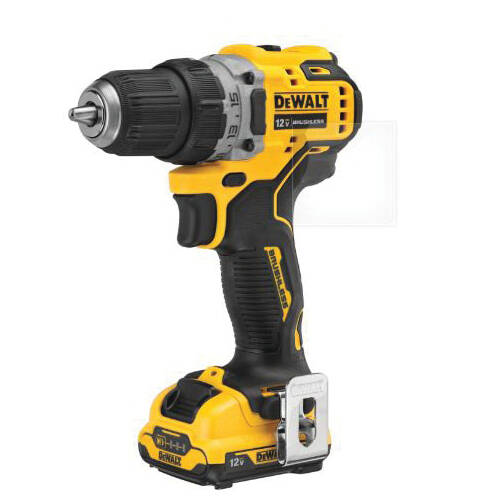 DeWALT Drill Kit, Battery Voltage: 12 V, Battery Capacity: 2 Ah, Chuck Type: Keyless, Chuck Size: 3/8 in , Motor Type: Brushless, Torque Rating: 250 UWO, 2 Speeds, No Load Speed: 0 to 425, 0 to 1500 rpm, Control Type: Trigger, Housing Material: Plastic, Yellow/Black, Dimensions: 7-1/4 in L x 5.97 in W, Includes: (1) DCD701B 3/8 in Drill, (2) DCB122 12 V Max 2 Ah Batteries, (1) Charger, (1) Tool Bag