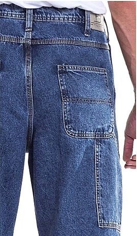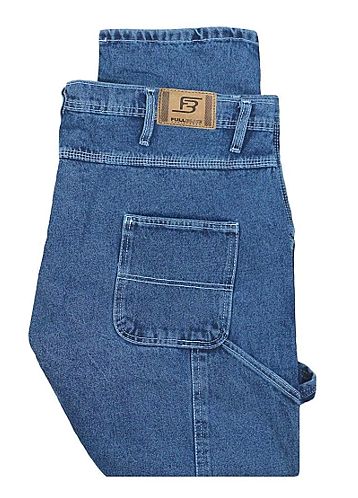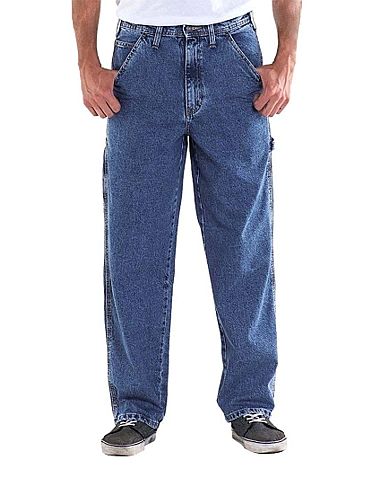 These Full Blue Carpenter Jeans come in a light wash and offer a loose fit. They are made of 100% cotton and feature a one button/zipper front closure.