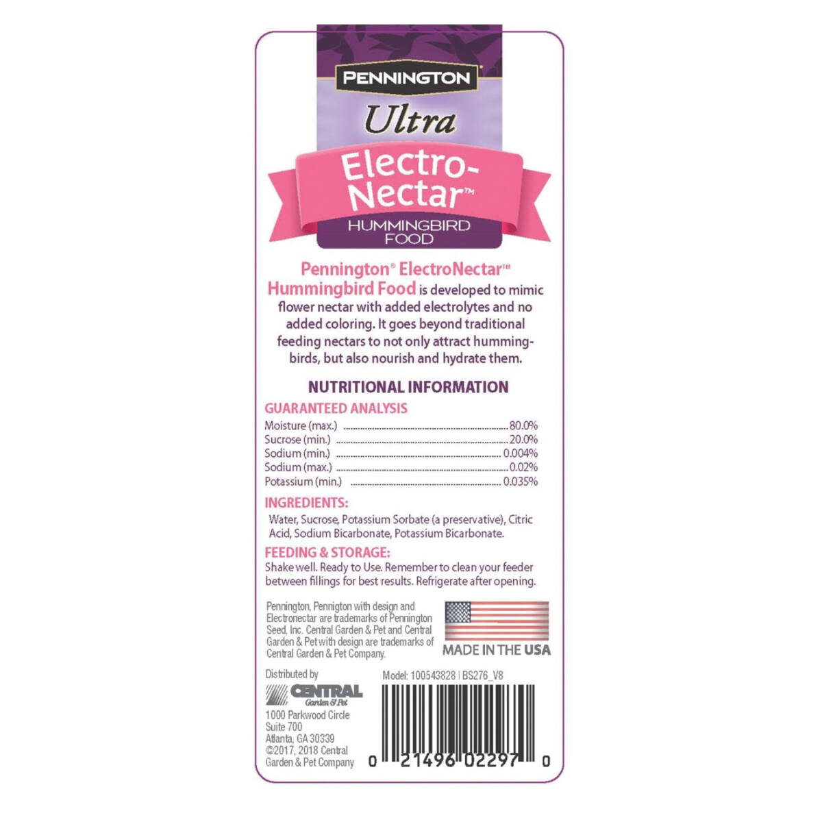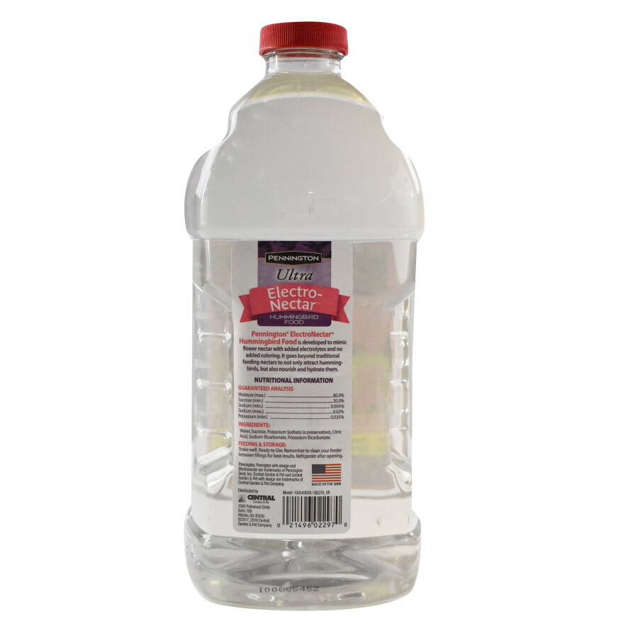 Pennington ElectroNectar hummingbird nectar is designed to attract hummingbirds to your feeder. This product is ready to use and requires no mixing. The ingredients are water, sugar and added electrolytes. These added electrolytes help keep your hummers hydrated and healthy, the top priority of hummingbird lovers. This naturally clear hummingbird food mimics flower nectar and it contains no red dye or other artificial colors. The lack of red color does not affect this nectar's ability to attract hummingbirds, as hummers find and enjoy clear nectar just as often as the red alternatives. For best results, clean your feeder before adding Pennington ElectroNectar. Refrigerate ElectroNectar after opening to retain freshness between refills.