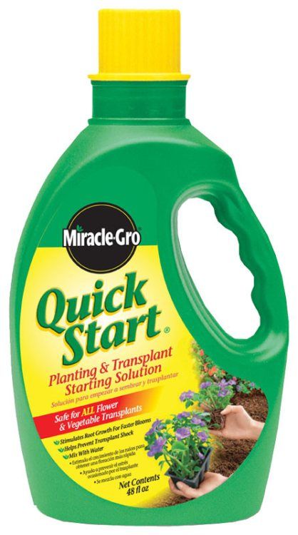 "Miracle-gro" Quick Start Liquid Plant Food Liquid quick start 4-12-4 formula. 48 oz Use when planting to prevent transplant shock. For all flowers, vegetables, trees & shrubs. Also for transplants & seedlings. Stimulates root growth for faster blooms. Simply mix with water when planting.