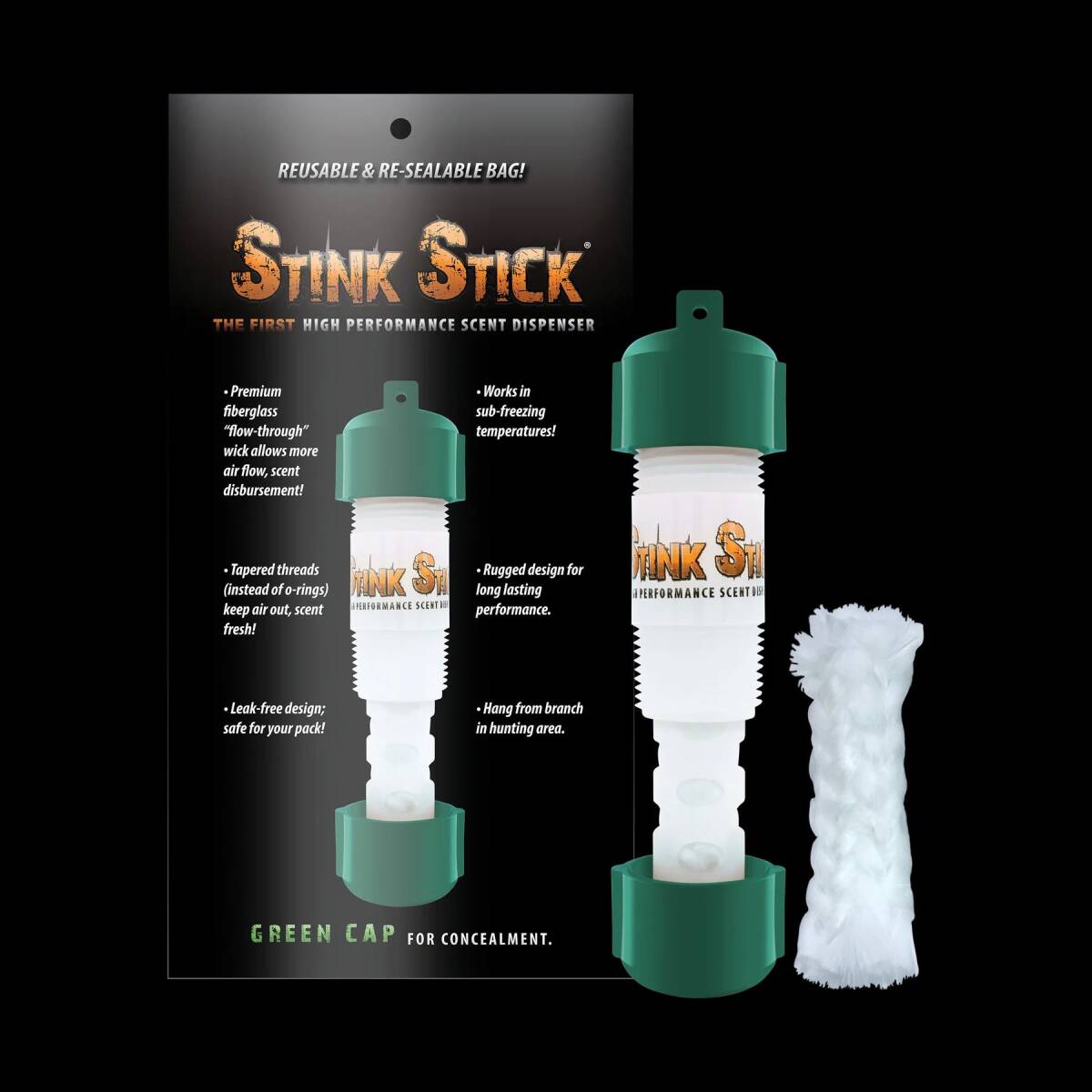 Stink Stick is a scent dispenser designed to work with any of our liquid scents. The compact, rugged design and replaceable fiberglass wicks gives you the ability to take scent in and back out of the woods with you.