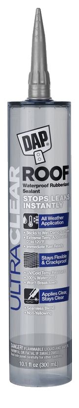 Ultra Clear Roof Waterproof Rubber Sealant is a crystal clear, elastomeric synthetic rubber sealant that stops and prevents minor roof leaks. It creates an invisible, ultra waterproof seal around roof fixtures and penetrations to keep out water, air and moisture, preventing damage. It applies crystal clear and stays clear for a seamless blend with substrates. Ultra Clear Roof can be applied in adverse weather conditions such as on wet or damp surfaces, through standing water and in extreme temperatures of 0F to 120F. It provides outstanding UV resistance so it wont yellow or break down over time. It stays permanently flexible and crack-proof even in cold temperatures, for a long-lasting, durable seal.