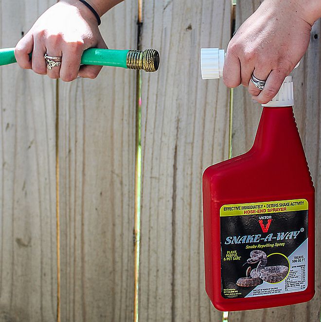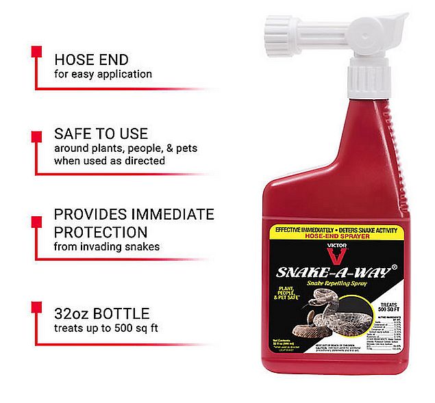 Victor Snake-A-Way repellent is tested and proven to repel venomous and non-venomous snakes. The powerful formula protects up to 500 sq-ft and allows you to deter snakes from areas around houses, cabins, garages, barns, woodpiles, trashcans, flowerbeds and more. Plus, the convenient hose-end bottle makes it easy to apply anywhere around your property. When used as directed, Snake-A-Way is effective at driving away snakes, without causing harm to people, pets or plants. Do not directly apply Snake-A-Way Hose-End to plants and crops intended for consumption. The unique blend of ingredients in Snake-A-Way work to temporarily disrupt a snakes sensory receptors via its auxiliary olfactory sense organ, also known as Jacobsons Organ. This reaction successfully disorients the snake, causing it to slither away unharmed to search for fresh air.