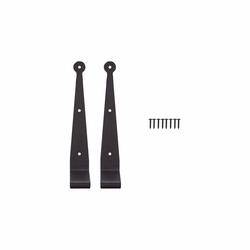 Stainless steel material. 2.5 mm thickness. Includes two strap hinges and 12 stainless steel square head screws for installation. 10 in length.