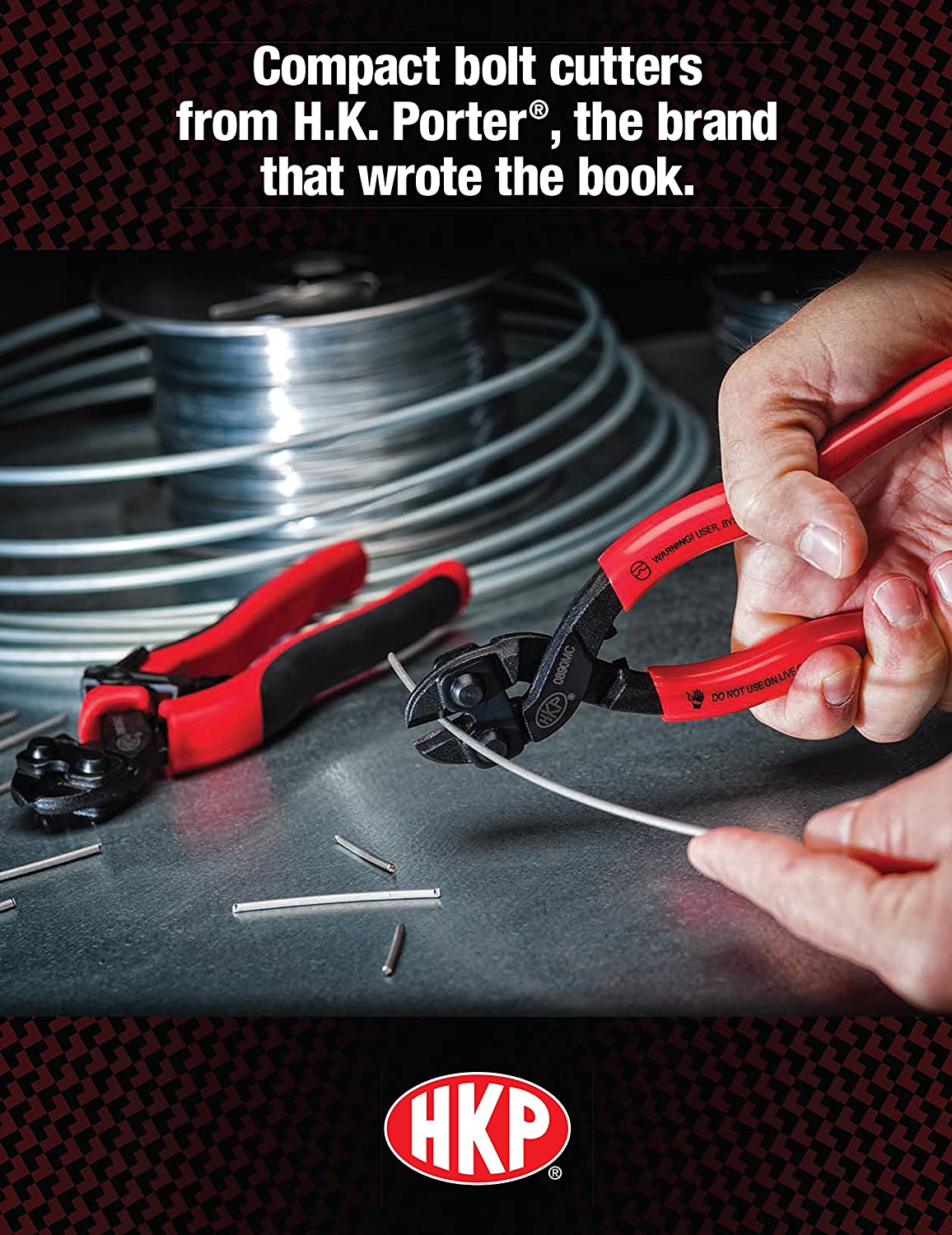 Compact bolt cutters from H.K. Porter, the brand that wrote the book. Induction-hardened cutting edges make quick work of the tough stuff. Compact cutting power with half the effort of standard Linemans pliers. Straight Cutter model has center cut blades for longest life. Angle Cutter model has flush cut blades for trimming close. Both have smooth plastic dipped grips for maximum durability and easy cleanup. For maximum comfort and minimum fatigue, the Spring Return Straight Cutter features co-molded grips and a durable return spring for repetitive-cut production applications. Its straight head and center cut blades make it fast and easy to use.