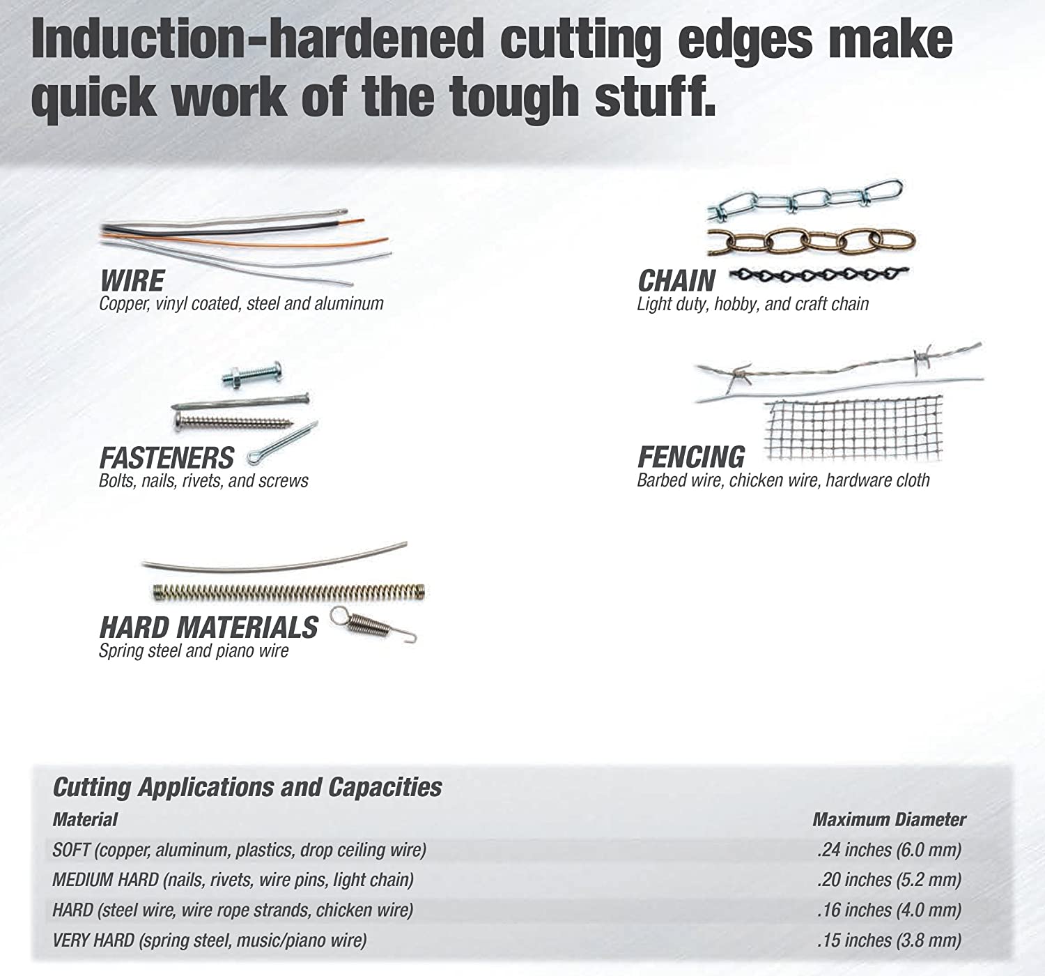 | Cutting Capacity | 1/4 in Copper Aluminum 0.2 in Communication Cable Soft Steel |