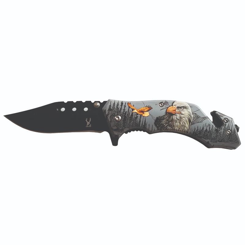 With a blade made of quality steel, the Big Water Eagle spring assisted folding knife can be used as a belt cutter and a glass cutter. The blade folds into a 4-1/2 in composite handle with a clip.