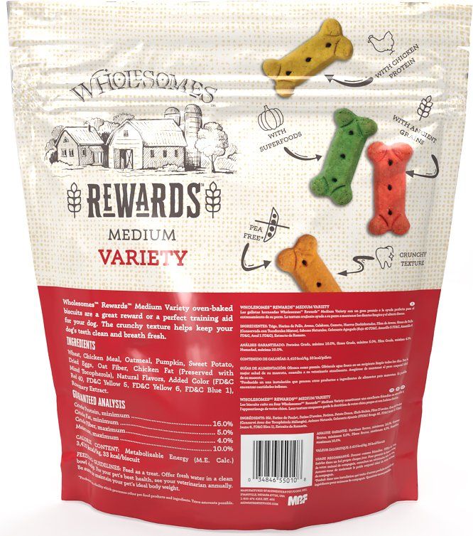 Wholesomes Rewards Variety oven-baked biscuits are proudly made in family-owned, USA kitchens. The crunchy texture helps your dogs teeth remain clean and healthy. Each dog biscuit treat is made with high quality chicken protein, ancient grains like oatmeal for heart health, and superfoods like pumpkin and sweet potato to help support a fit lifestyle for your dog. Use these pea-free crunchy treats as a reward or training aid!