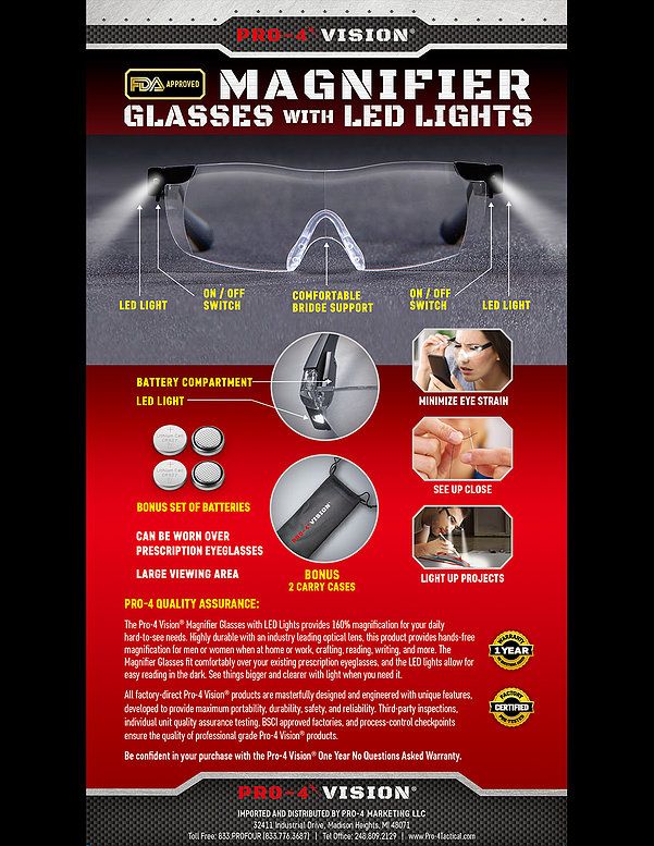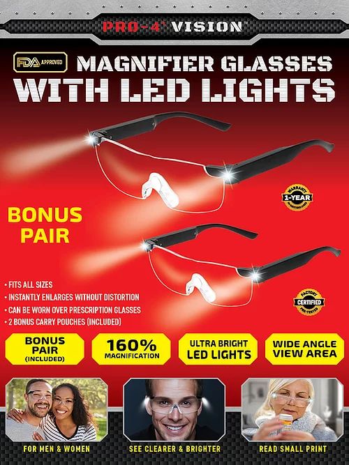 The Pro-4 Vision Magnifier Glasses with LED Lights provides 160% magnification for your daily hard-to-see needs. Highly durable with an industry leading optical lens, this product provides hands-free magnification for men or women when at home or work, crafting, reading, writing, and more. The Magnifier Glasses fit comfortably over your existing prescription eyeglasses, and the LED lights allow for easy reading in the dark. See things bigger and clearer with light when you need it.