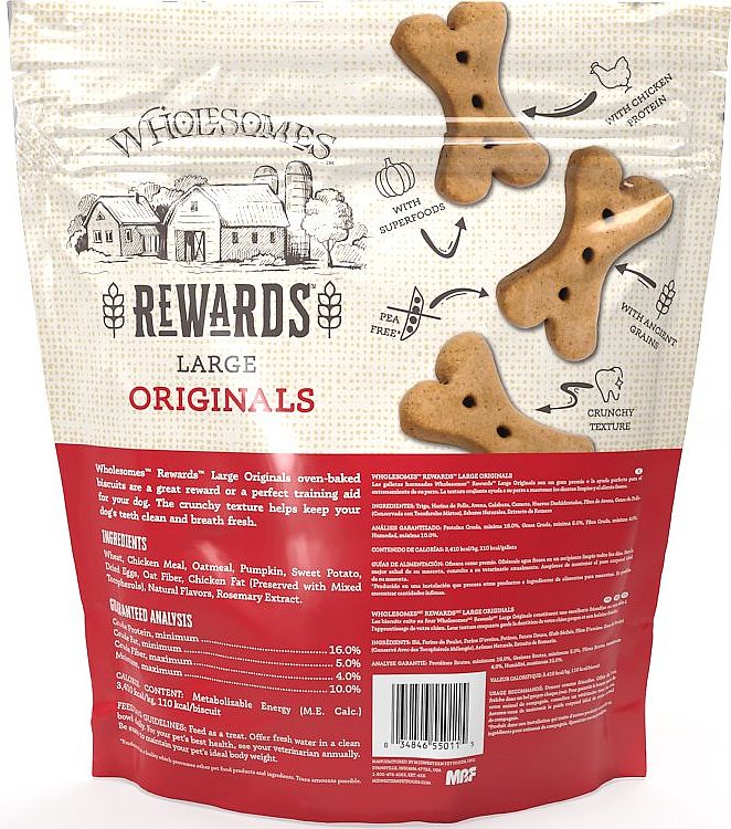 Wholesomes Rewards Originals oven-baked biscuits are proudly made in family-owned, USA kitchens. The crunchy texture helps your dogs teeth remain clean and healthy. Each dog biscuit treat is made with high quality chicken protein, ancient grains like oatmeal for heart health, and superfoods like pumpkin and sweet potato to help support a fit lifestyle for your dog. Use these pea-free crunchy treats as a reward or training aid!