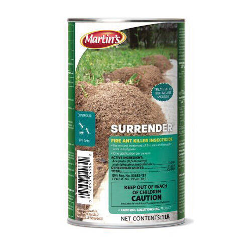 Surrender fire ant killer contains 75% acephate and is used for controlling fire ants. One can of Surrender will treat up to 108 fire ant mounds.