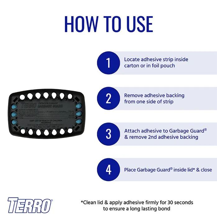 Trash bins can be a dirty, bug-filled place but they dont have to be! TERRO Garbage Guard is effective against a variety of flying and crawling insects that are commonly found in trashcans. For your convenience, TERRO Garbage Guard is incredibly easy to use. Simply remove the backing from the adhesive strip and attach the pod to the underside of your trash can lid. Then just close the lid, and let the vapor do its work! This product is designed for use in outdoor or garage trash bins and dumpsters only.