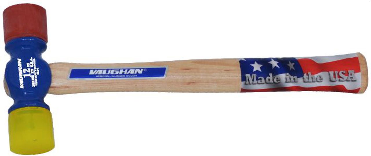 This soft face hammer by Vaughan is 12 oz and has a forged steel head that lends force to blows. It has a rust-resistant powder coat finish. Each hammer comes assembled with two replaceable faces: soft (red) and hard (yellow). Hardwood handle. "Sure-Lock" wedged. MADE IN USA