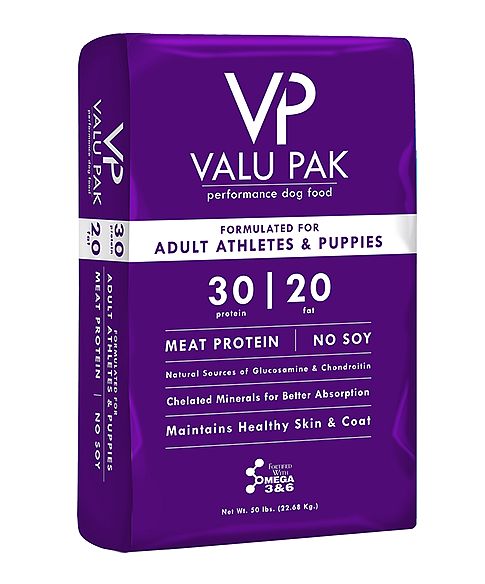 30-20 Performance Dog Food For Adult Athletes & Puppies contains no soy and maintains healthy skin and coat.