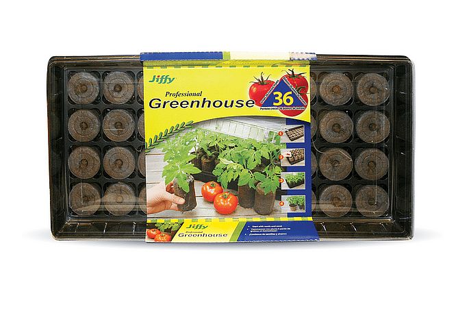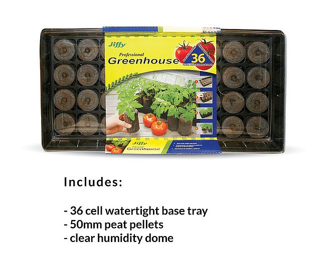 Includes One (1) 36 cell watertight base tray, one (1) clear plastic humidity dome, and thirty-six (36) 50mm peat pellets.