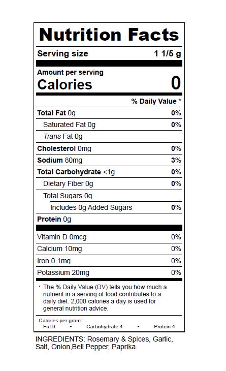Ingredients Rosemary, Spices, Garlic, Salt, Onion, Bell Pepper, Paprika.