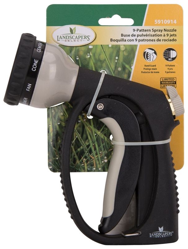 Heavy-duty die-cast metal body for maximum strength. Contoured soft grip with hand guard. Control switch regulates water flow. Locking clip allows continuous water flow.