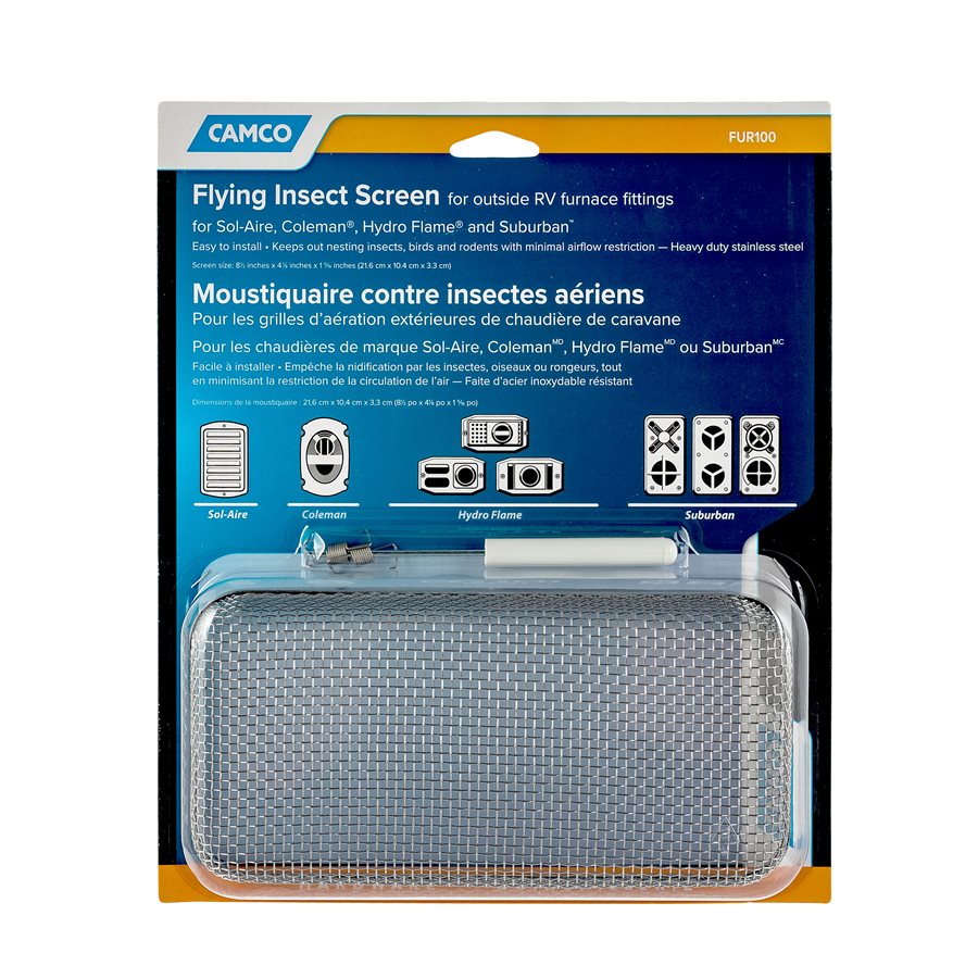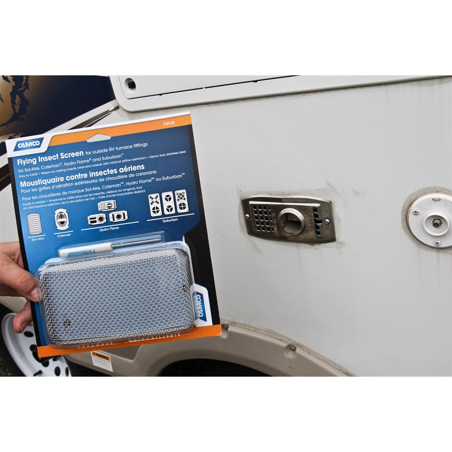 Wasps, mud daubers, birds and rodents pose a serious threat to the furnace on your RV. They can enter through the furnace vents and cause serious damage by building nests that interfere with air flow. Camco 42140 (Model FUR 100) Flying Insect RV Furnace Screen fits Colman, Suburban, Sol-Aire and Hydroflame furnace vents. As Camco offers several furnace screens, consult size and photos to confirm this screen will fit your furnace. This easy to install screen will help ensure that your furnace vent stays free from costly invasion by unwanted pests.