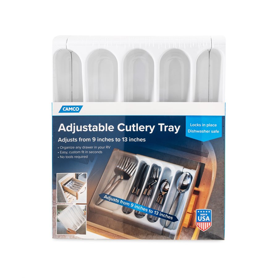 Camco White RV Adjustable Cutlery Tray is sized to fit into RV drawers. It slides out from both sides for an easy custom fit. Adjusts from 9 in to 13 in x 1.75 in tall. Patented.
