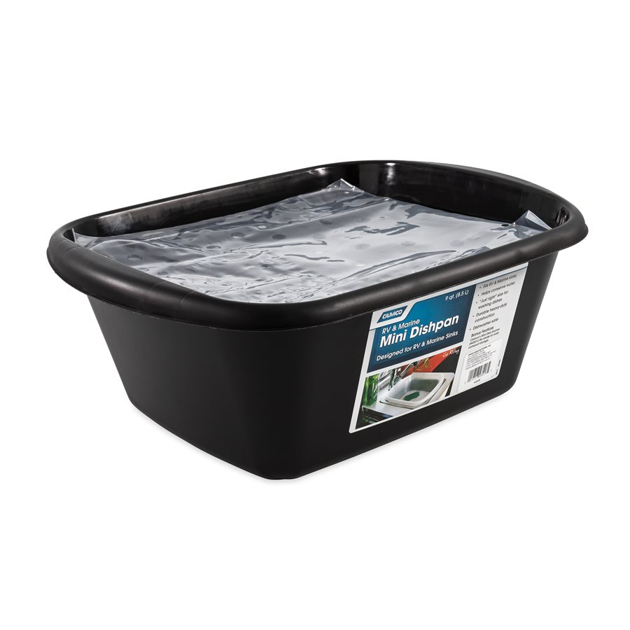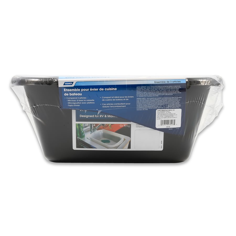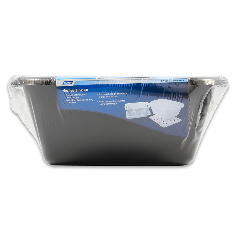 The Camco Sink Kit makes doing dishes in your boat or RV a breeze. The dish drainer can hold full sized plates, cups and utensils for up to six people. The sloped tray helps excess water run off into your sink and doubles as a lid. The dish pan and sink mat all nest together with the dish drainer for compact storage. Perfect for galley sinks and limited counter space.