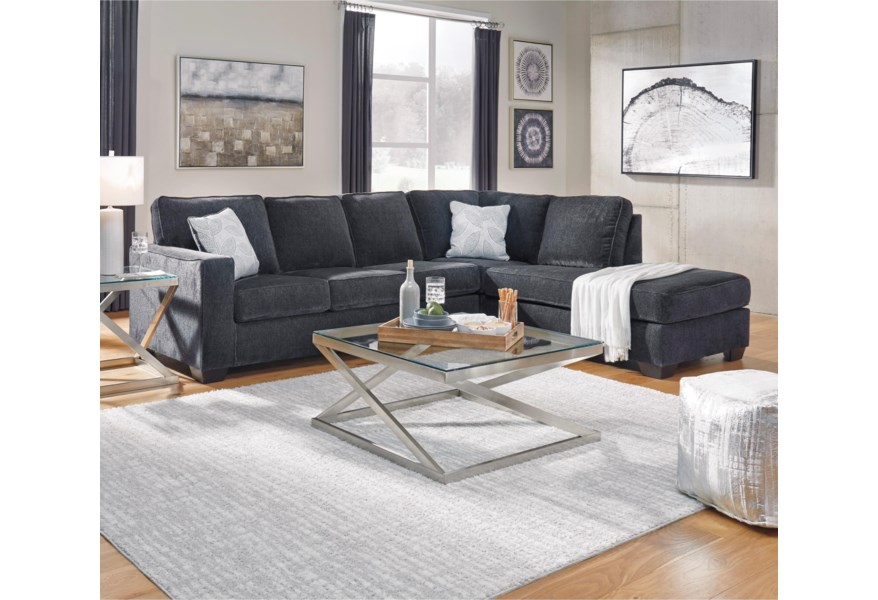 If style is the question, then the Altari 2-piece sectional is the answer. Sporting clean lines and sleek track arms, the decidedly contemporary profile is enhanced with plump cushioning and a chenille-feel upholstery, so pleasing to the touch. Sure to play well with so many color schemes, this sectional in slate gray includes a pair of understated floral pattern pillows for fashionably fresh appeal.