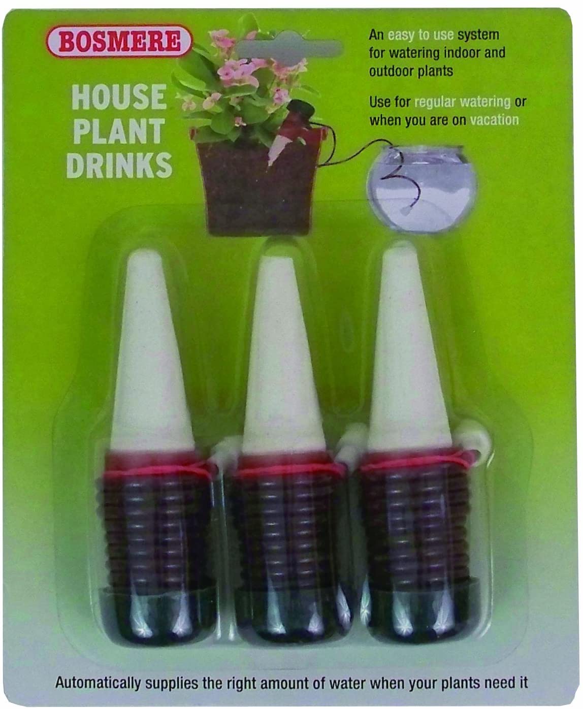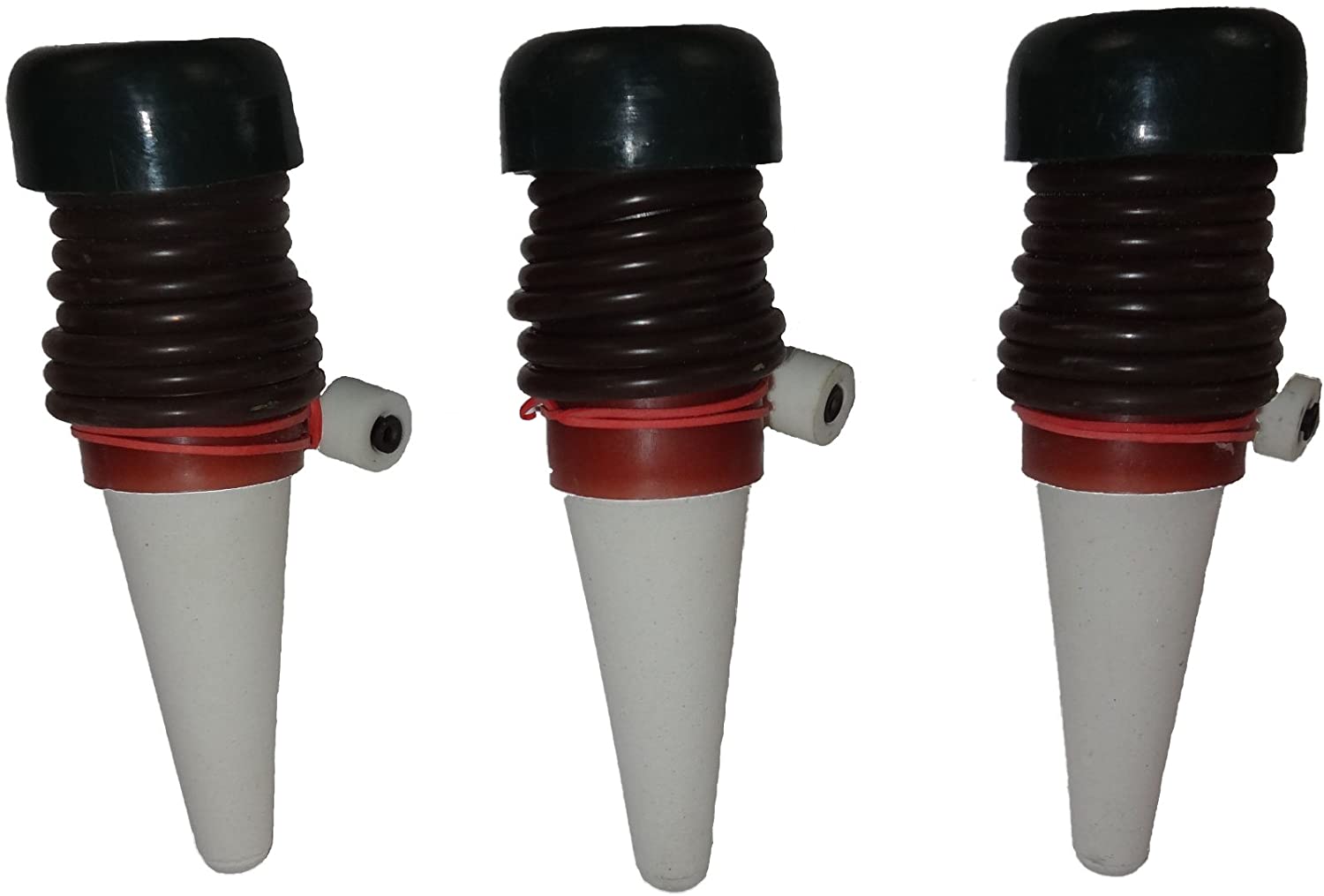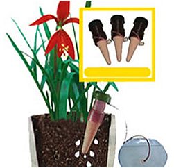 A pack of three ceramic watering spikes. Place one in the soil next to your plant and fill it with water. Place the tube end in a bowl of water and your plants will be watered automatically while youre away on vacation. No more coming back to dried out plants. Fertilizer can also be added to the Drink.