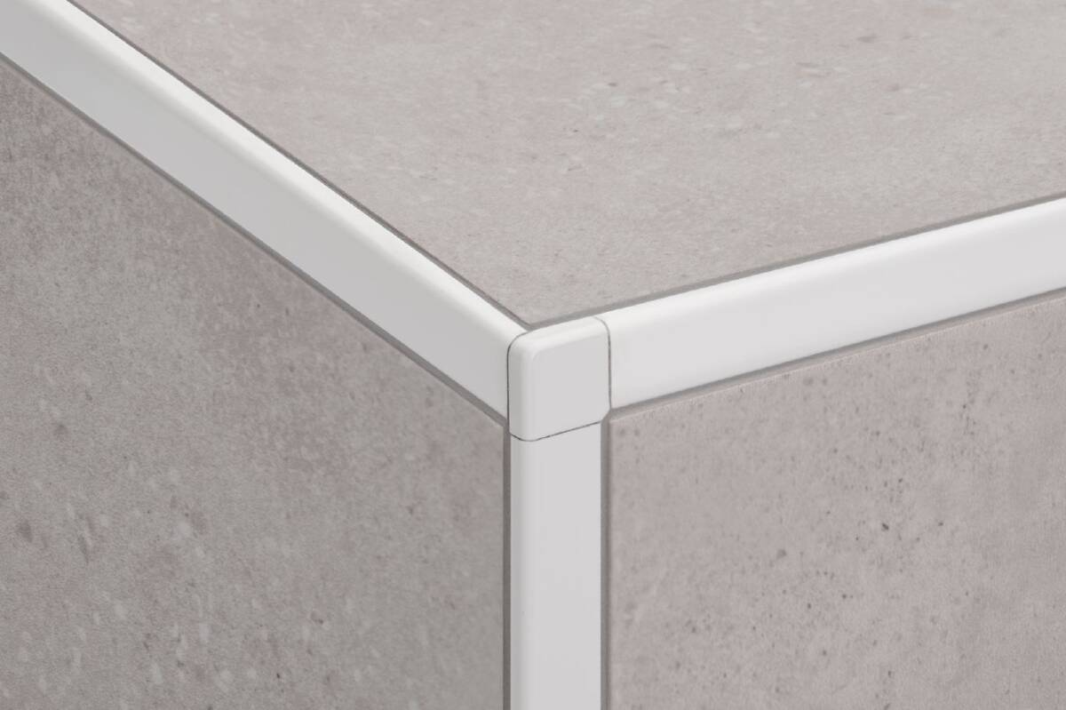Schluter®-JOLLY features a 90° angle and is a finishing and edge-protection profile for the outside corners and other tile edges in wall applications. The vertical wall section of the profile provides a decorative finish and protects adjacent tiles. Its 90° angle creates a clean, flush look on wall corner installations, and the joint spacers on both sides of the profile ensure consistent grout joints and perfect symmetry. Matching corners are available, which feature innovative plug-in connections that result in clean, visually appealing corner applications.