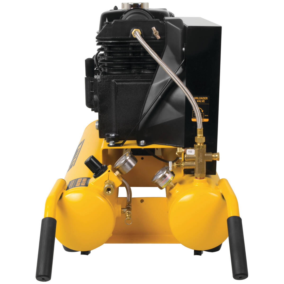The DeWALT 8 gal air compressor has a powerful and reliable Honda GX160 engine, helping to ensure trouble-free operation with easy start and the ability to drive high pump performance. The cast iron, twin cylinder pump with a thermally stable cast iron twin cylinder body and valve plate delivers a surge of air power and recovery needed to run extra nailers. A fully enclosed metal belt guard covers and protects moving parts, while a ball drain valve allows for quick and thorough tank draining.