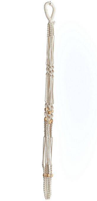 Primitive Planters 42 in No Tassel Hanger is made of 100% cotton and holds a variety of pot sizes up to 12 in . Don't like tassels? Well this hanger is made just for you! This unique plant hanger has lots of fancy knotting and several light colored wooden beads to add an even more decorative touch. The top of the hanger is wrapped with the woven cotton to make a thick loop. Use with Primitive Planters S Hooks or Hanger Hooks for easy hanging. The natural color of this plant hanger matches with any indoor decor. Use this hanger to hang your favorite pot or basket. The pot will rest perfectly in this hanger for a clean look.