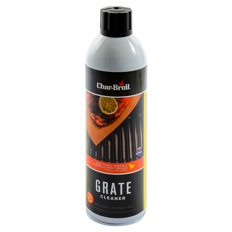 The Grate Cleaning Aerosol Spray by Char-Broil is ideal for cleaning messy grids, grates, side shelves, cart frames, castings and windows. The non-toxic citrus formula is safe for all cooking surfaces and the foaming action helps clean hard-to-reach areas.