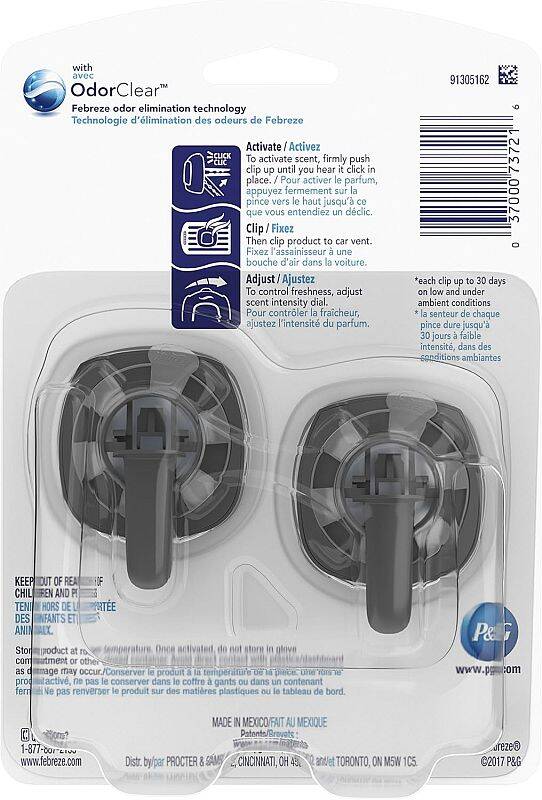 Febreze CAR cleans away vehicle odors with OdorClear Technology so they're gone for good. Simply attach this car air freshener to the air vent to begin cleaning your car of odors and slowly release a light, fresh scent for up to 30 days. These tiny car vent air fresheners have incredible odor blockers and odor eliminators that remove all those stinks and smells built up from your longest, commute-iest days. Simply push the vent clip firmly until you hear it click to activate fragrance, then clip onto your car vent and drive stink-free for a whole 30 days.
