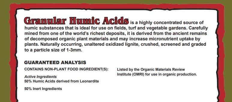 | Ingredients | Humic Acids Derived From Leonardite 50%, Inert Ingredients 50%. Listed by the Organic Materials Review Institute for use in organic production. |